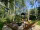 много красивых елей и берез на участке, засеян газон
